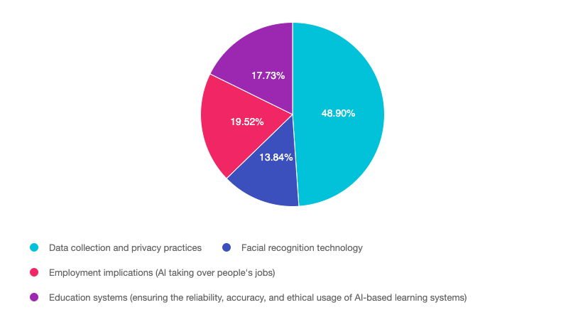 Specific areas where workers want oversight and tighter management concern data collection and privacy practices, with 49% of U.S. workers choosing it as their top priority, followed by safeguarding jobs from being replaced by AI (20%); ensuring the reliability, accuracy, and ethical usage of AI-based learning systems (18%); and facial recognition technology (14%).