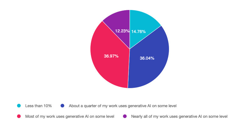 AI continues to weave its way into the fabric of work. According to survey data conducted by Zoho, Generative AI tools are applied to 'most' work-related tasks for 37% of US respondents, with 36% reporting "about a quarter" of their daily work are touched by AI. Among tech workers specifically, 36% note that AI touches 'nearly all' aspects of their job, compared the 12% of all US workers across all industries.