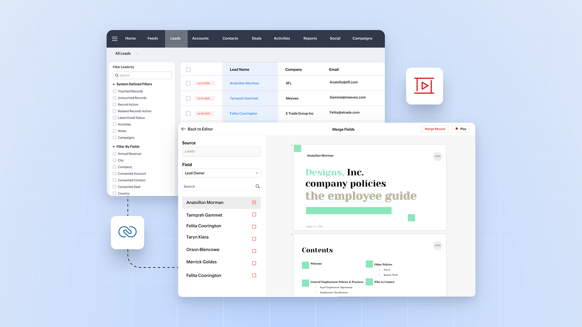 Zoho CRM integration, enabling teams to merge dynamic CRM fields into templates and generate multiple personalized presentations at scale.